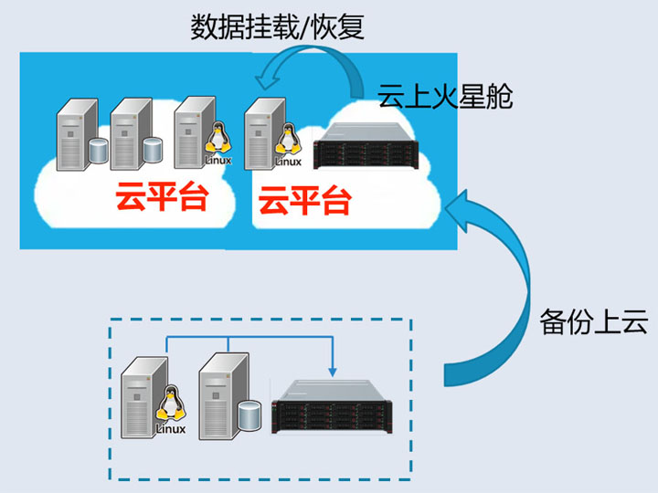 云平臺+本地火星艙+云上火星艙,該方案實現云端數據恢復、云端業務接管、云端容災等服務。